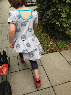 Muckelinchen gehört ja eher zu der Kategorie Ronja Räubertochter und zieht äußerst selten Kleider an. Als sie aber den coolen Stoff mit den Brillen-Füchsen gesehen hat, sagt sie doch tatsächlich zu mir sie möchte gerne ein Kleid daraus haben. Das habe ich mir natürlich nicht zweimal sagen lassen!